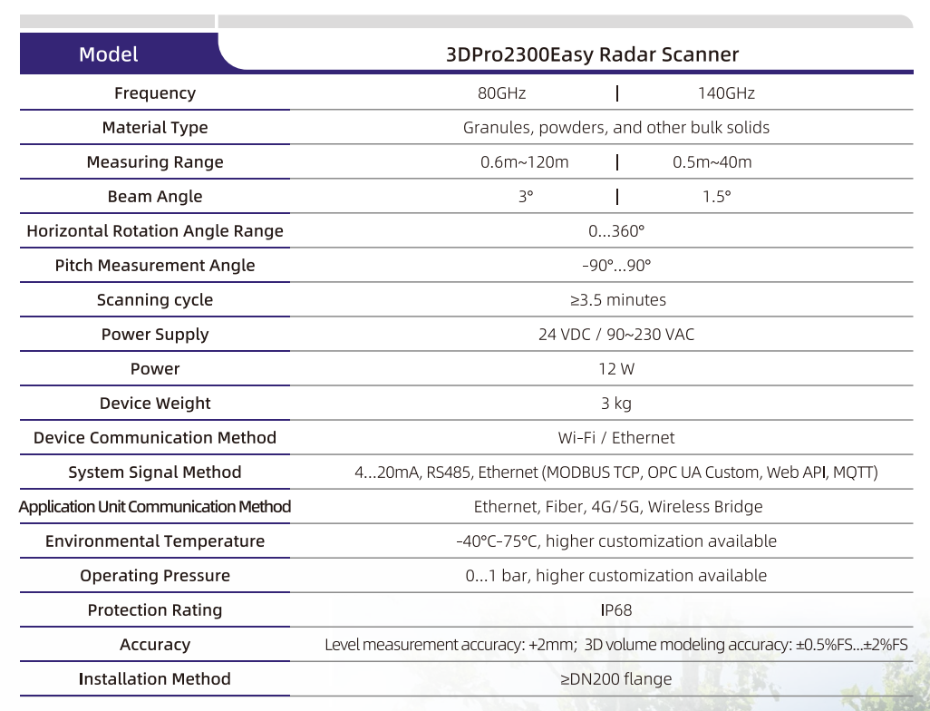 High-Precision 3D Scanning The 3DPro2300Easy Radar Scanner uses 6,000 scanning points and a 360° horizontal, 90° vertical rotational structure for precise 3D mapping of material surfaces, calculating levels, mass, and volume. Compared to traditional systems with fixed angles, it offers superior accuracy and generates real-time, detailed reports for better operational insights.