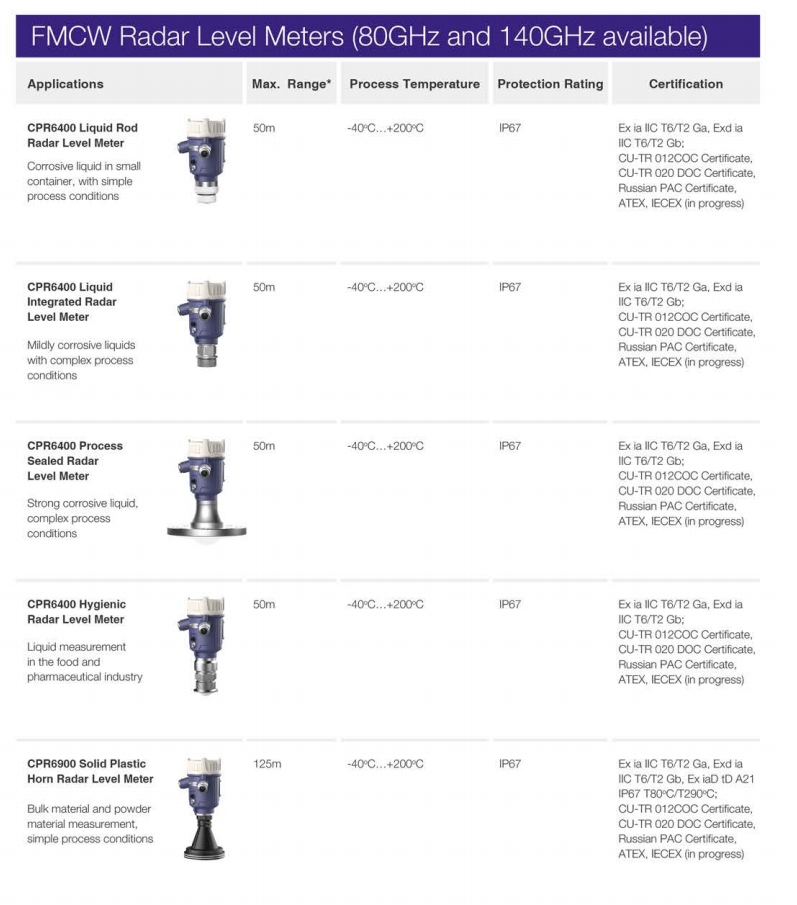 The CPR6400 and CPR6900 series radar level meters use FMCW frequency modulated continuous wave technology for 80 GHz radar level meters. The radar emits a 76-81GHz high-frequency microwave signal with linear frequency modulation, which is emitted from the radar antenna. When the microwave signal encounters the surface of the measured medium, some of its energy is reflected back by the surface of the medium and received by the radar antenna. A part of the microwave transmitting signal in radar is mixed with the received signal to obtain the difference frequency signal. The differential frequency signal is obtained by Fourier transform algorithms such as FFT or DFT to obtain the differential frequency spectrum signal, thereby obtaining the frequency difference. According to the linear frequency modulation signal frequency difference is proportional to time thus the time difference is obtained. Based on the time difference and the distance between the antenna and the surface of the measured medium, the distance between the antenna and the surface of the measured medium can be calculated.